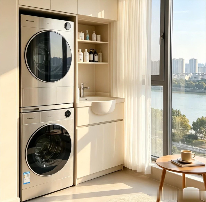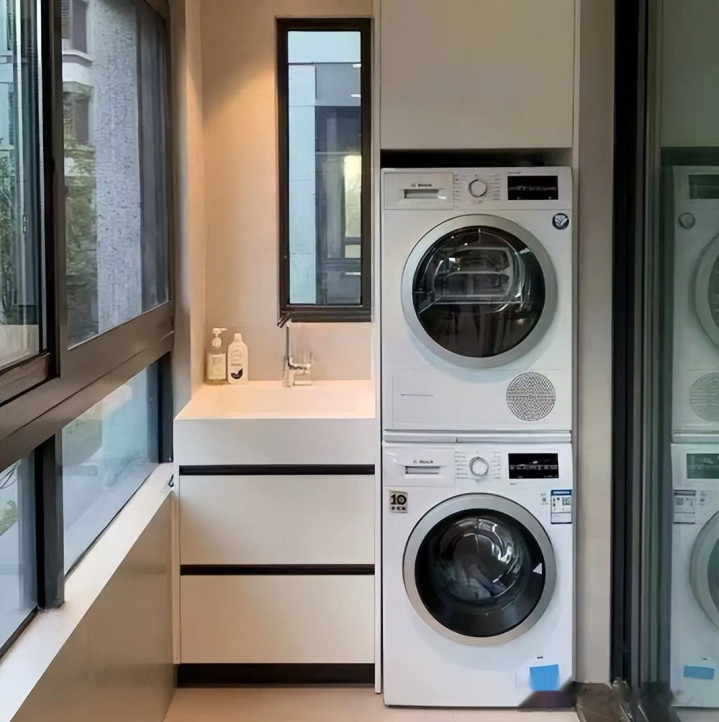 我是在靠墙的位置装上了洗衣柜子,把烘干机都嵌入到里面,烘干方便还干净。